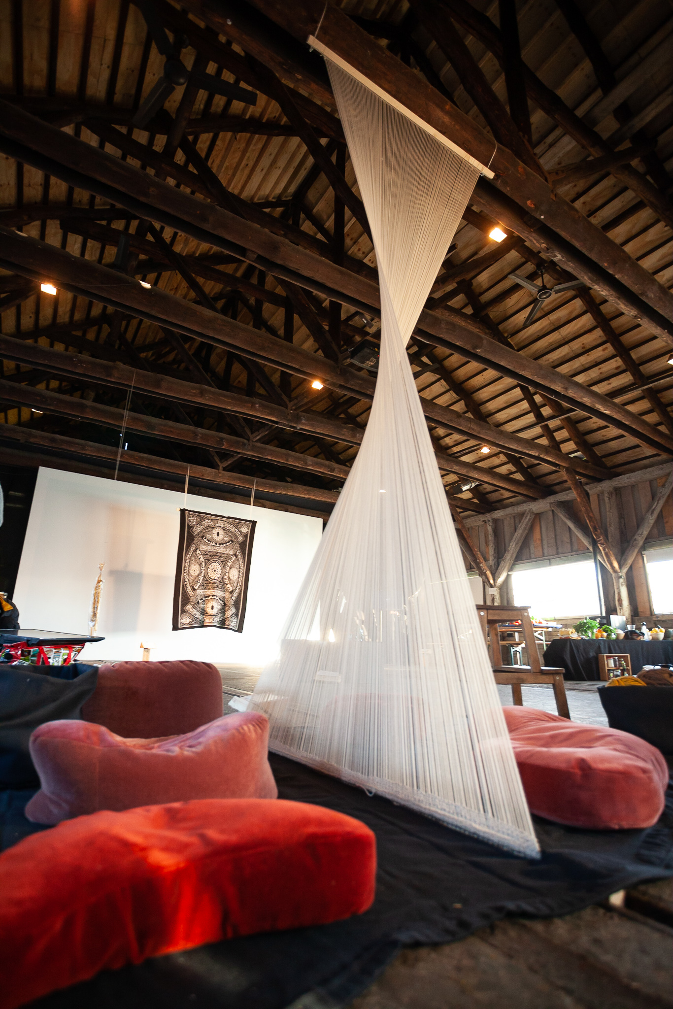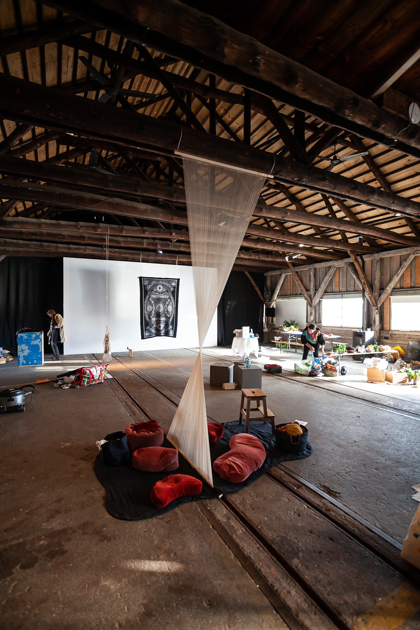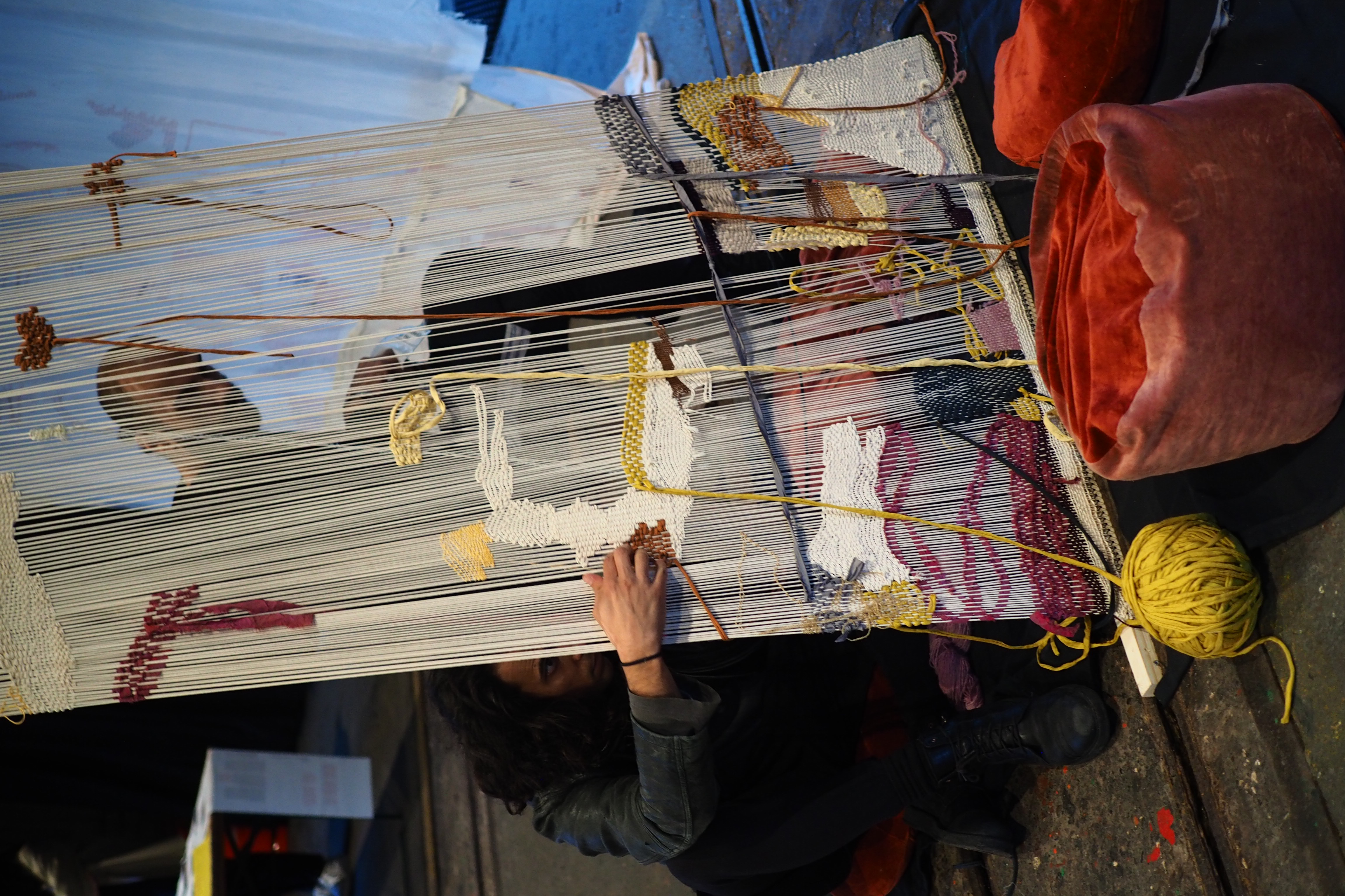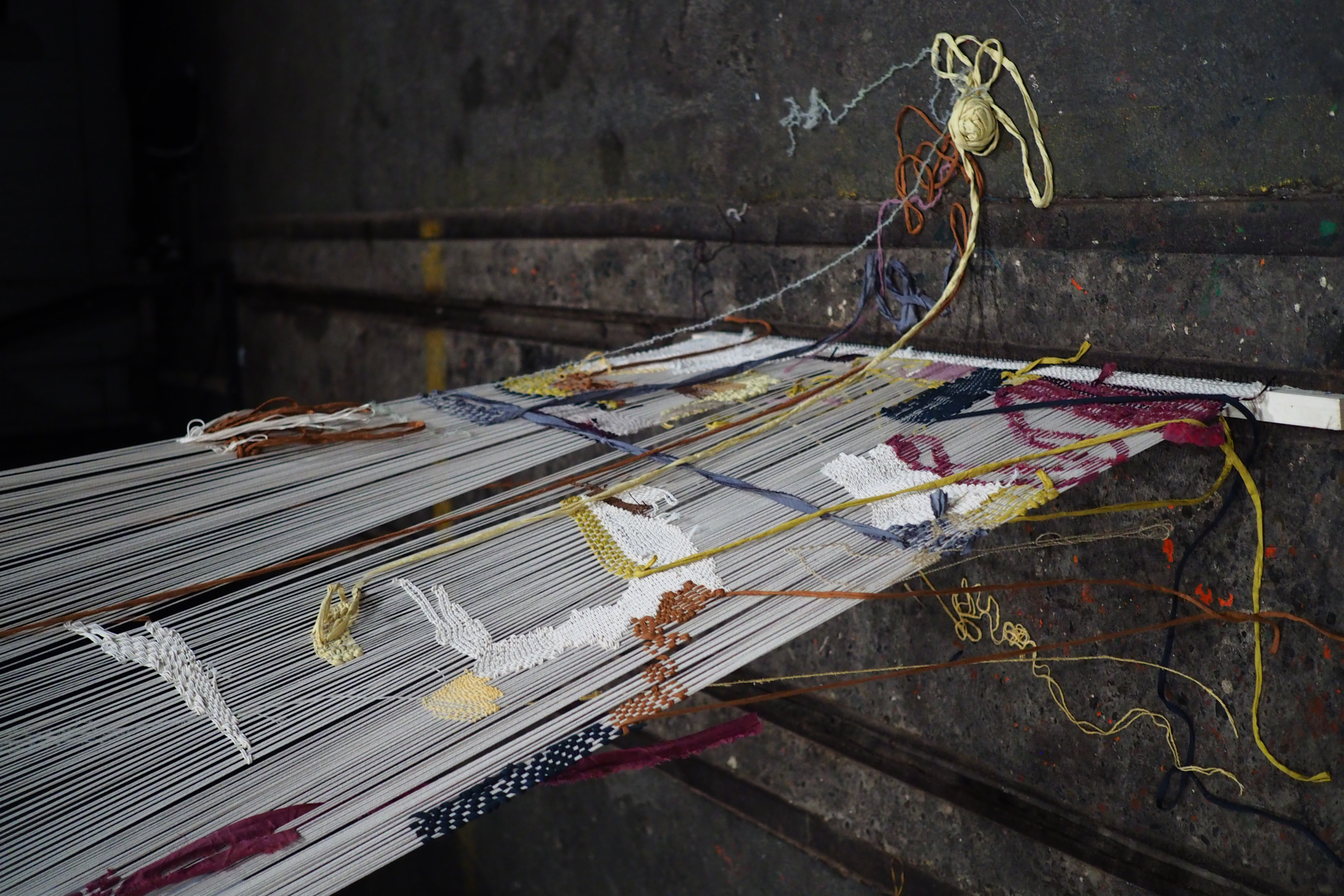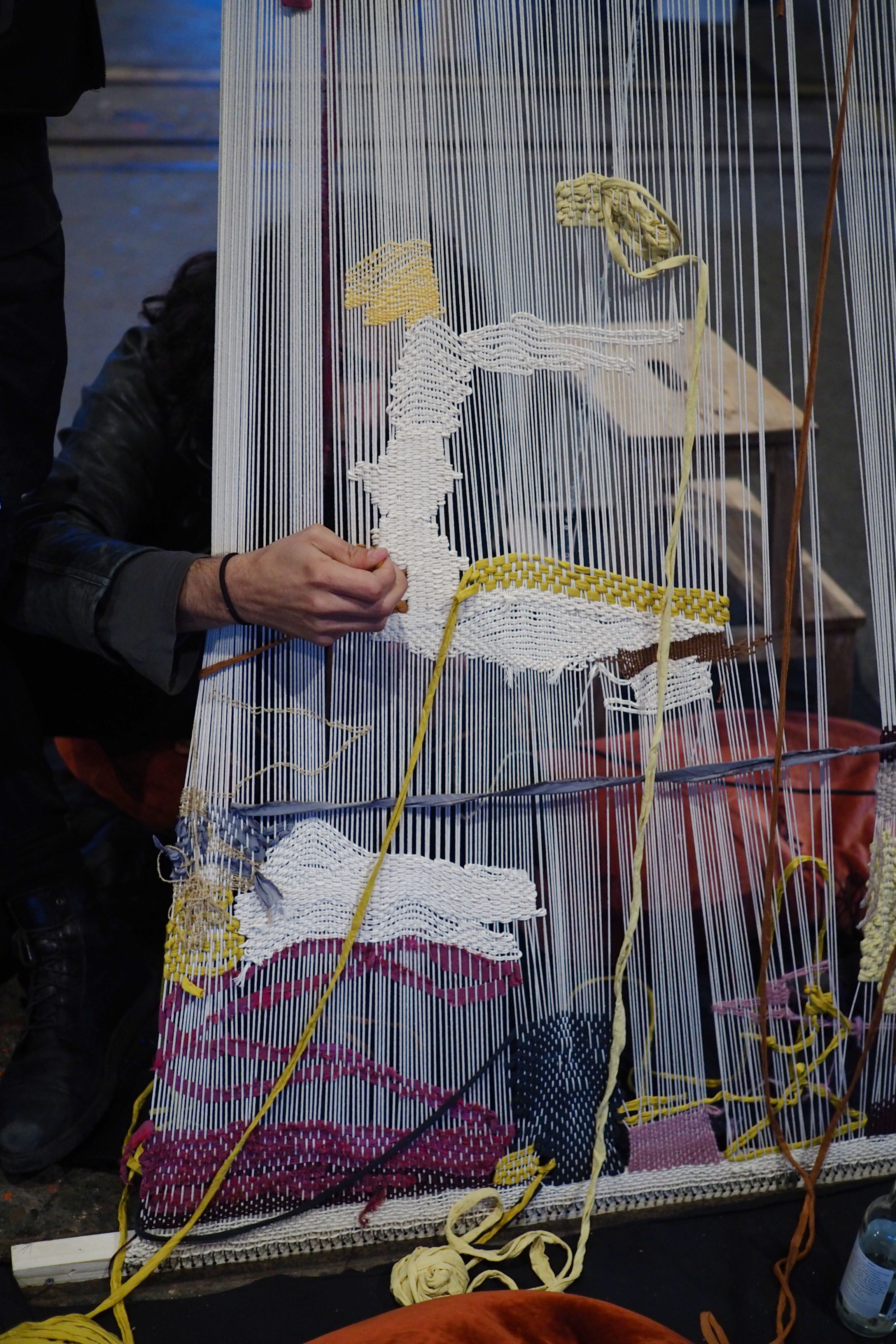 The loom I built, I call it thread space rather than a frame, stretches ist warp threads up to a wooden beam, responding to the architecture of the space. On the night of the opening we started weaving collectively. I started to weave from the bottom, in white cotton threads, the same material as the warp. I decided to restrict myself to only that material, the white cotton thread; it seems to me like a skeleton, building the main structure of this weaving in space.