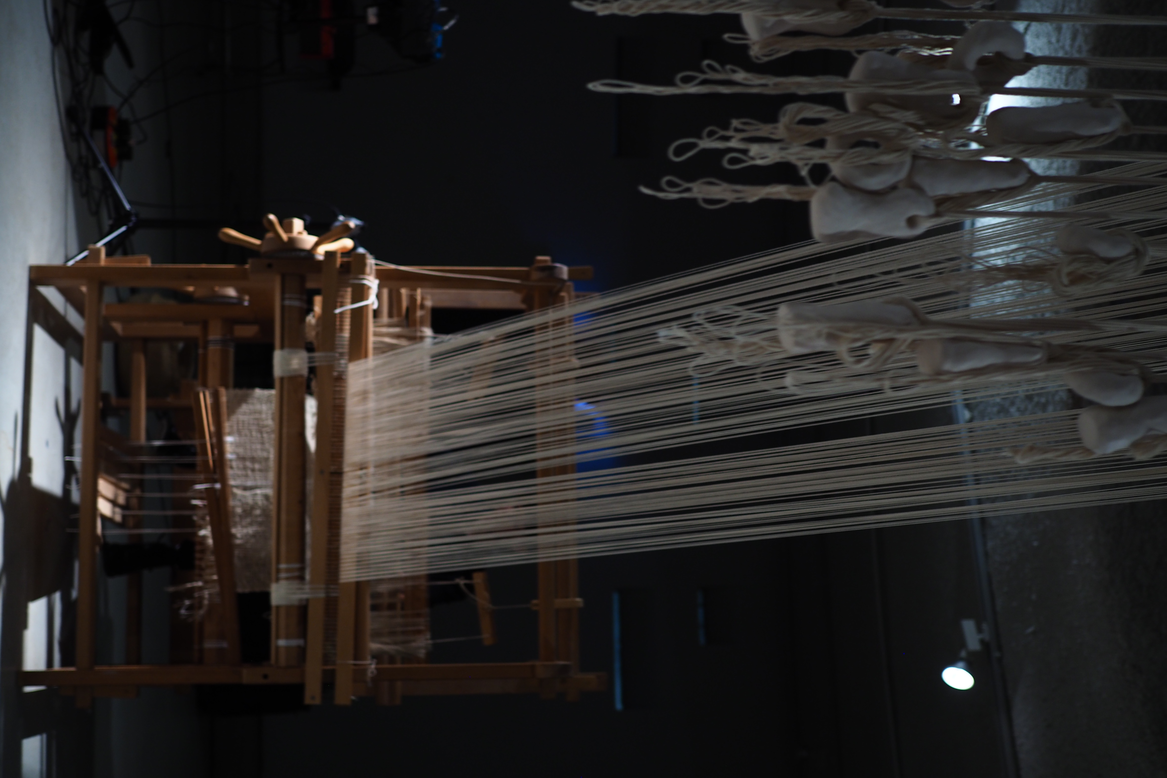 During the event “Fall Back: Eternal Returns V: Fall Back to the Loom: Recurring Figures in a weaveworld” I performed weaving alongside different musicians and fibre artist Samm Lewis. The experimental interplay of the sounds of weaving, spinning and various instruments lasted for two hours. The warp, usually wrapped around the part of the loom called the warping beam, was stretched across the room, held in tension by the weight of ceramic birds. As the interweaving of instruments and sounds of making fabric proceeded, the warp got shorter and shorter, letting the birds fly high.